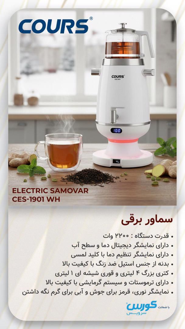 • سماور برقی کورس: قدرت دستگاه 2200وات دارای نمایشگر دیجیتال دما وسطح آب دارای نمایشگر تنظیم دما با کلید لمسی بدنه از جنس استیل ضد زنگ با کیفیت بالا کتری بزرگ چهار لیتری وقوری شیشه ای یک لیتری دارای ترموستات و سیستم گرمایشی با کیفیت بالا نمایشگر نوری قرمز برای جوش آبی برای گرم نگه داشتن